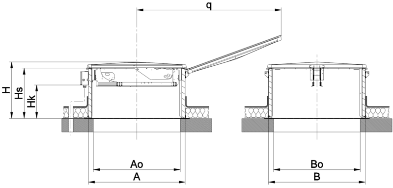 Die Abströmeinheit besteht aus einem isolierten Dachsockel mit dicht schließender Dunkelklappe. Der Dachsockel besteht aus verzinktem Stahlblech und ist innen mit nicht brennbarer Mineralwolle isoliert. Die Dunkelklappe ist mit einem Überschlagsantriebssystem ausgerüstet ist, so dass ein Öffnungswinkel von ca. 155° realisiert wird, um eine weitgehende Windunabhängigkeit sicherzustellen.