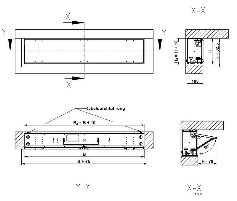 Ein seitlicher Mindestabstand von 200 mm ist einzuhalten. Wand- und deckenbündige Einbausituationen sind auf Anfrage realisierbar.