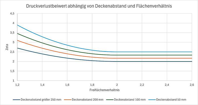 Das nachfolgende Diagramm ermöglicht die Bestimmung des Druckverlustbeiwerts in Abhängigkeit vom Freiflächenverhältnis und dem Abstand zur Decke. Das Freiflächenverhältnis beschreibt das Verhältnis der freien Abströmfläche zur Einströmfläche und kann der nachfolgenden Tabelle entnommen werden.